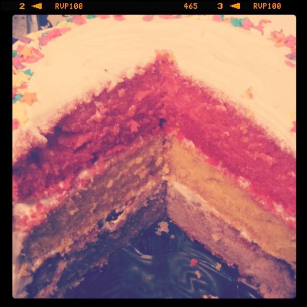 Now to enjoy a slice of my experimental Rainbow Cake…. And take the rest to my colleagues in the morning!