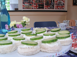 The afternoon tea party menu consisted of open top sandwiches (cucumber, fresh mint & soft cheese and egg mayonnaise & cress), warm cheese scones with herb butter & red onion chutney, chocolate and also raspberry meringue kisses with lemon curd swirled clotted cream, raspberry tartlets with vanilla creme patisserie, a Jubilee-inspired layer cake with blackcurrant & cassis jam (Home made by Deborah, my lovely jam lady) and decorated on top with blueberries & raspberries in the shape of the Union Jack to keep it in line with the weekends’ celebrations.