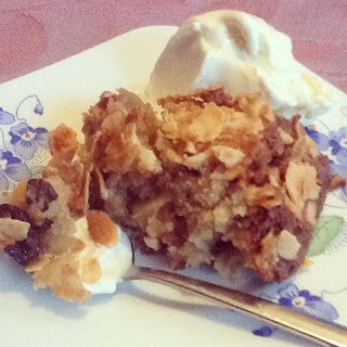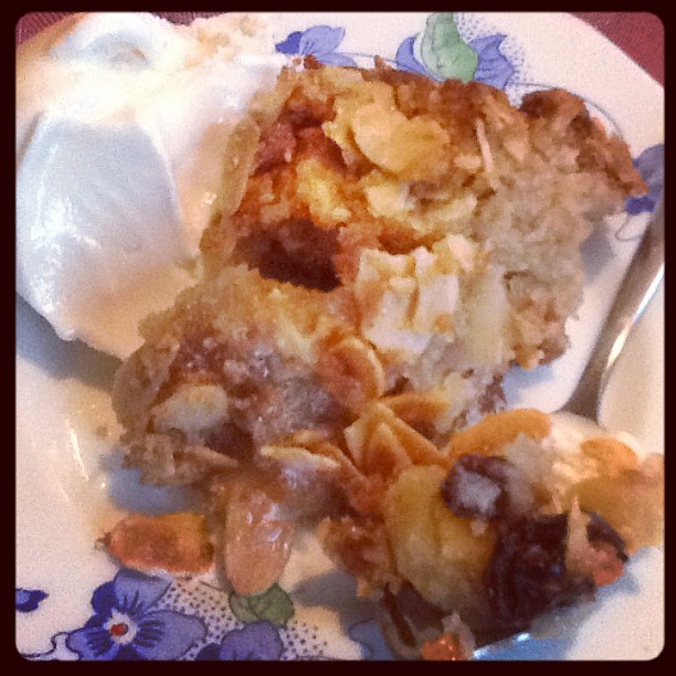 A warm cake, straight from the oven, not a beautifully formed layer cake, but a substantial and warming sweet sponge with a crunchy almond topping to comfort us on this freezing cold June weekend, which could be mistaken for an Autumnal weekend in October currently.