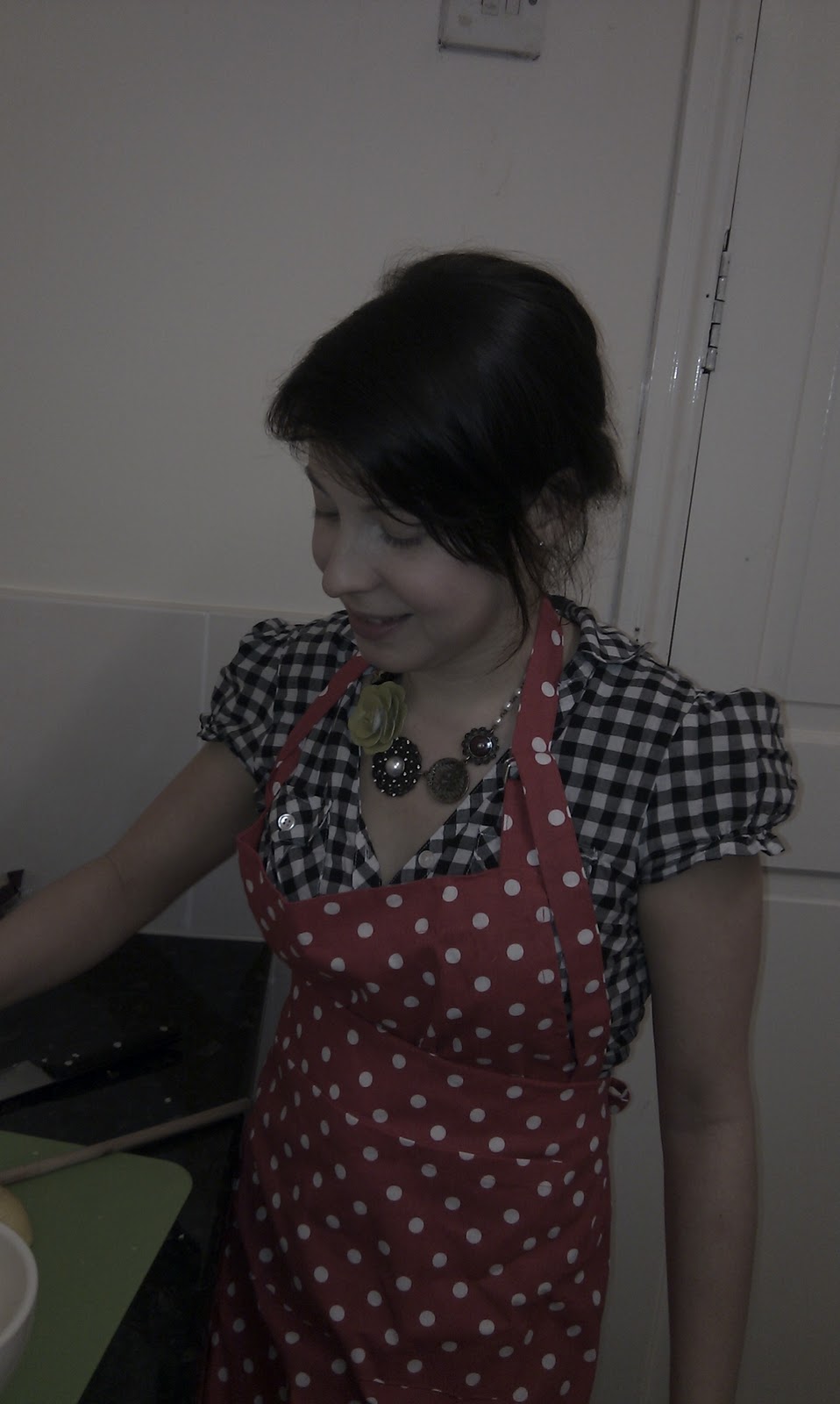 Helen from Candy Handfuls says: Here is a picture of me in my apron…. I have a collection of aprons, most of these are vintage. However this one is handmade and was a Christmas gift from my boyfriend. I love it because its got the cheeky vintage look that I love so much. but also because it makes me feel a bit like a Stepford wife when I’m wearing it!