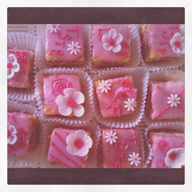 And we then chopped the square sponges up into smaller squares and had fun making lots of mess dipping them in different bowls to try out the consistency of different mixes. We finally found the right one for our future class and we managed to cover the table in the stuff… All part of the fun! Cat had also decided to cut hers out into circular shapes which actually looked just as nice as the square shapes… All pretty pink cakes and it didn’t stop there!….