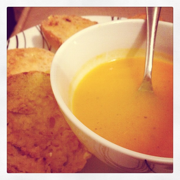 One of my favorite and simplest soup recipes is a Butternut Squash and Pepper soup, best served with a nice freshly made bread roll, or more lately, I have been toying with crumpet recipes.