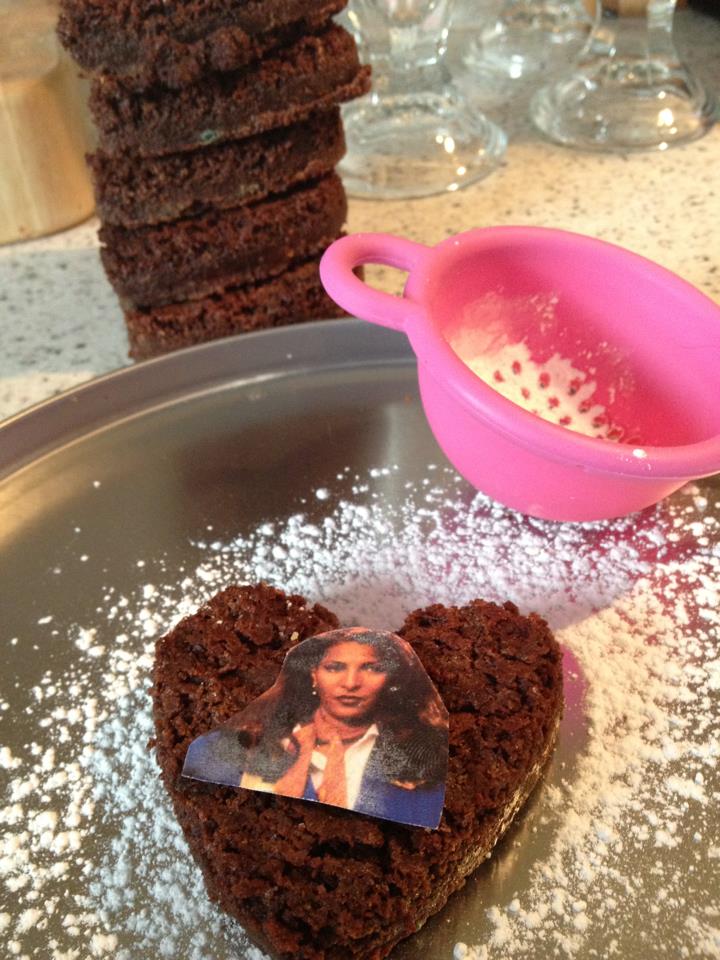 I cut out the lovely Pam Grier shape out and dusted over each brownie with icing sugar.