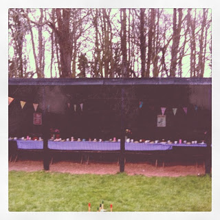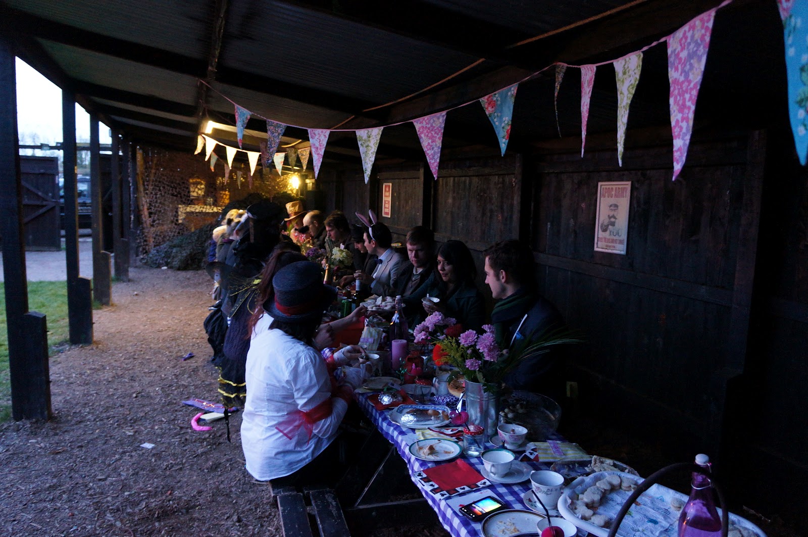 We hosted the Scary Unbirthday Tea Party in the woods at Apocalypse Paintball in Kneesworth, on the very outskirts of Cambridgeshire. This venue allowed us to get creative and set up a very long table, laid with colourful tablecloths and vintage mis-matching china as well as place names, *Eat Me*& *Drink Me* labels and bottles for guests to play around with and of course, little goodie bags filled with silly treats for the child in every guest.