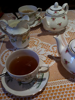 The table was Laid with a very cute sugar bowl with a traditional beaded net covering the cubes, as well as a very pretty lace tablecloth which reminded me of my grandmas kitchen table.