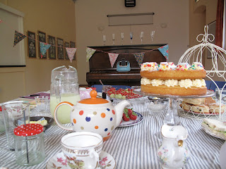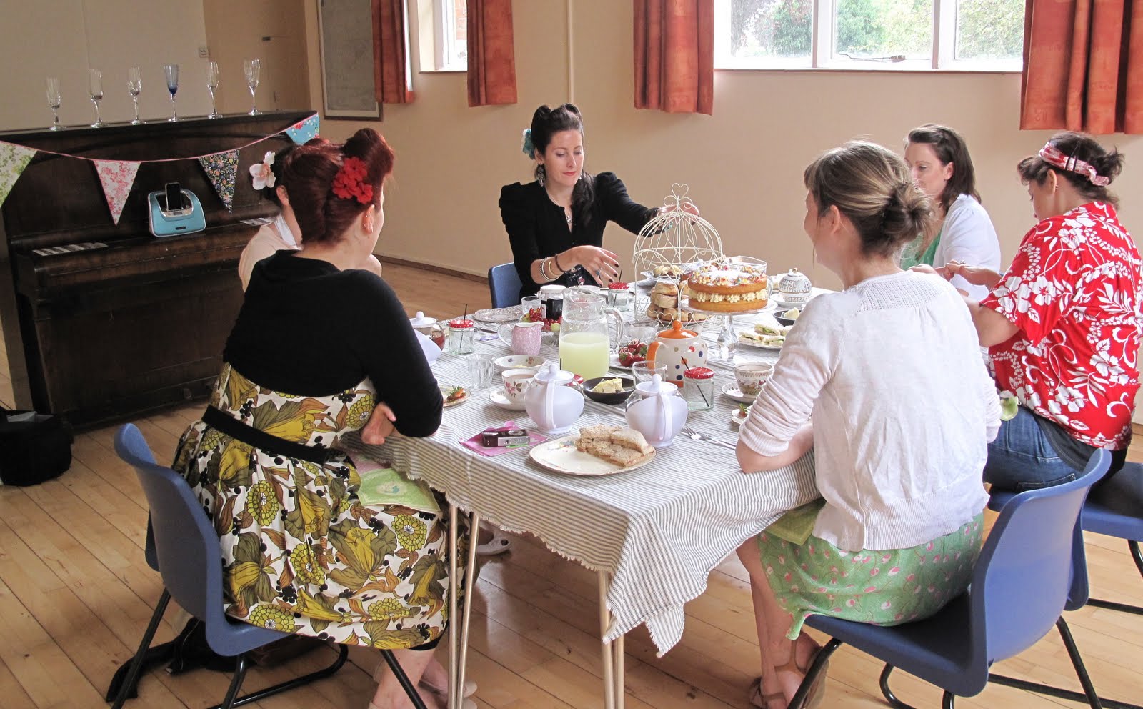 It started to look as though it might rain (And it did as soon as my guests arrived) so I made the right decision in setting up their lovely afternoon treats inside the lovely and traditionally British Village Hall with it’s high vaulted ceiling, and lovely piano that I used as a focal point (As well as a champagne glass holder should they have brought their own bubbles… of which they did : )