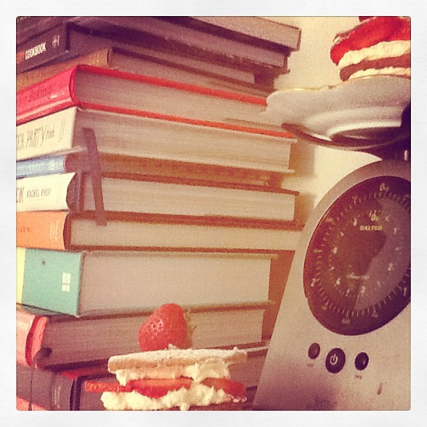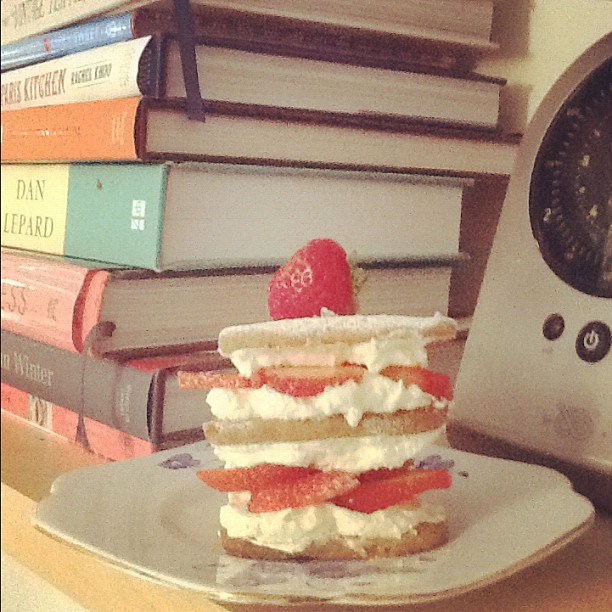 Then for another messy bit… add a little more cream onto the top of the second biscuit, and some more strawberries, then finally a thin layer on the underside of the third biscuit which you can then press lightly onto the very top for the third (and last) layer.