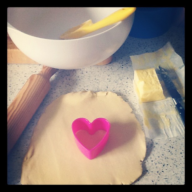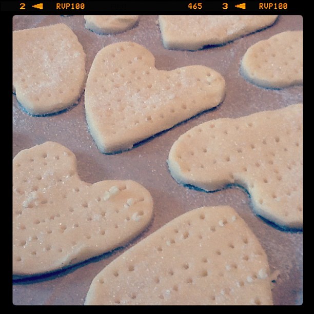 Cut into good sized rounds or any shape of your choice (I went for hearts : ) and place onto a baking tray. Sprinkle with icing sugar or granulated sugar and chill in the fridge for 20 minutes until firm. (If you have any leftover, you could make mini shortbreads instead of throwing away the excess… I added a few choc chips to mine to try and they were delicious!)