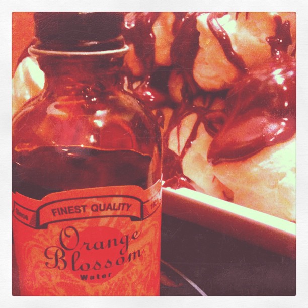 For the filling, whip together the cream and orange blossom water until soft peaks form when the whisk is removed, then gently fold in the caster sugar. When the profiteroles are completely cold, pipe the cream into each profiterole with a piping bag and medium pointed nozzle, through the incision, and arrange on a serving dish or pretty plate