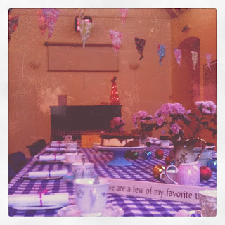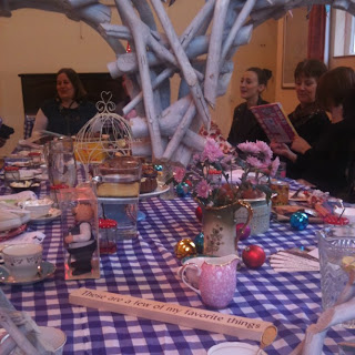 On arrival, guests were asked to place their gifts under (well in fact, around, as it was fairly small) the little Xmas tree placed on top of the piano at the top of the table of this fabulous tea party venue of mine.