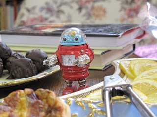 My piece de resistance was my first ever Victoria Sponge… Made with a light vanilla sponge, sandwiching together a shed load of piped vanilla buttercream and the most spiffing Forest Fruit jam (Made locally of course by my lovely jam lady!) which added a beautifully sweet and fruity texture to this cake. I was so proud, I could not help but add to it by adding a little robot, complete with footsteps across the icing sugar path on the top! It was the main attraction for this afternoon and my guests all shouted *YES* as soon as I asked if I should cut it!… It was hilarious!