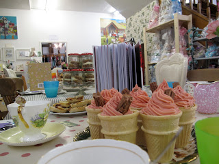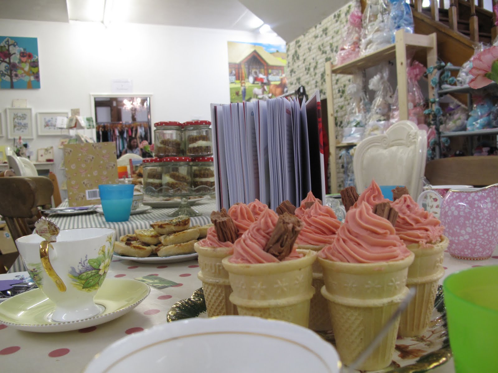This was the perfect venue to invite my 16 guests to visit and spend their pocket money whilst also enjoying my menu of Savoury Pancetta & Red Onion Tartlets, Sandwich selection including the popular Ham & Garlic Jam filling, as well as my tempting Caramelised Pecan -Topped Scones with Apple & Rhubarb Preserve & Clotted Cream, Raspberry Ripple Layer Cake (Which had just about survived the heat by the time it came to cutting and serving) and the Cupcake Selection including my Caramel Ice Cream Cones and Carrot Cake in a Jar. It was such a fun menu to prepare and I did enjoy taste testing as I went along. Naturally.