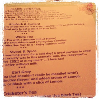 The Tea served at this afternoon event was a mix of the favourite blends from Tea Box, including Cricketers Tea and Rhubarb & Custard, both firm favourties and I would be silly not to offer them, both being fantastically different. I also sampled a new and locally sourced tea from Kandula Tea (Based in Peterborough) and a popular choice was their Ceylon Pink, which is suggested that you drink romantically with an edible flower, such as a rose… The serving suggestion that they make was far too risque to mention on my tea menu on the day… But visit their website for their cheeky suggestions. I love them so much!